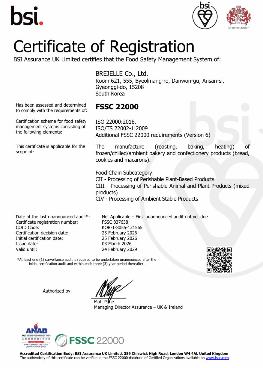 브레젤르는 원재료 선정부터 제조 공정까지 전 과정에 걸친 품질 경영 시스템을